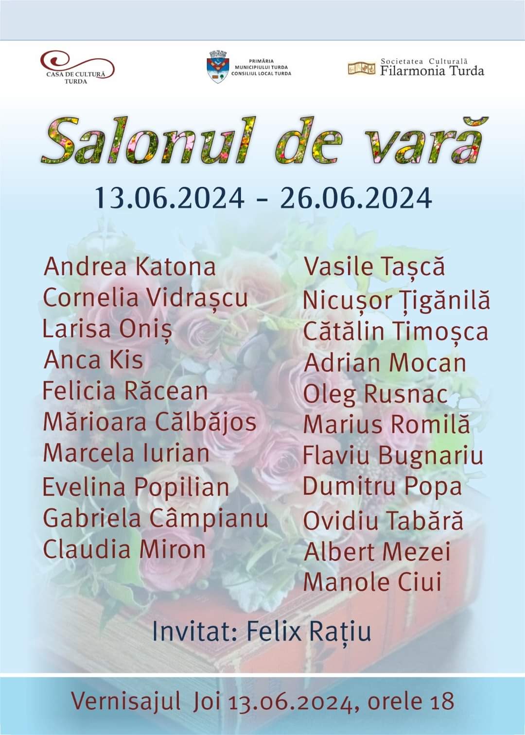Joi, 13 iunie, de la ora 18.00, vă așteptăm la Galeria de Artă „Valer Suciu” Turda, unde Societatea Culturală Filarmonia va prezenta lucrările din cadrul SALONULUI DE VARĂ. Ne vom delecta cu un joc antrenant de culori îndrăznețe și o plajă largă de genuri plastice : compoziții, naturi statice, peisaje, artă abstractă și fotografie artistică.