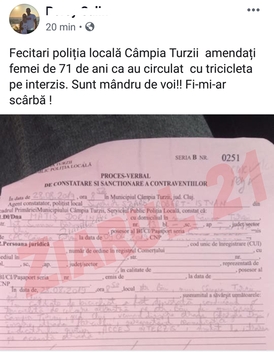 O femeie în vârstă de 71 de ani a fost amendată de Poliția Locală Câmpia Turzii pentru că circula pe sens interzis pe o tricicletă. Mesajul cu amenda a fost postat pe rețelele de socializare și a stârnit un val de indignare. Agentul care a sancționat femeia este fostul viceprimar din Câmpia Turzii și spune că a aplicat legea iar legea nu se aplică preferențial!
