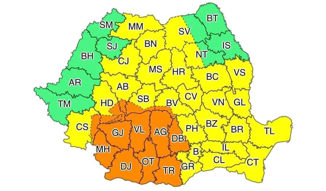 În Oltenia, vestul și nord-vestul Munteniei și local în Carpații Meridionali, instabilitatea atmosferică va fi accentuată, iar în intervale scurte de timp, dar mai ales prin acumulare, se vor înregistra cantități de apă de 50…90 l/mp.