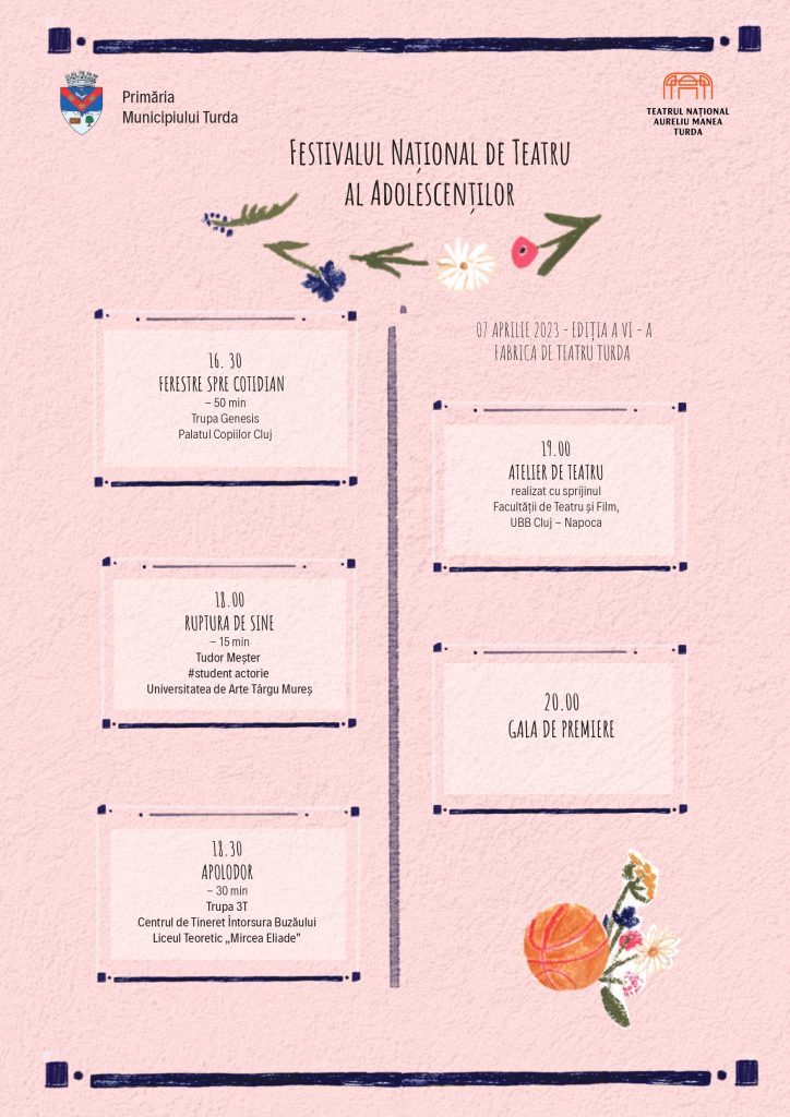 Tinerii sunt așteptați vineri 7 aprilie, începând cu orele 16.30 la Fabrica de Teatru Turda, la cea dea VI-a ediție a Festivalului Național de Teatru al Adolescenților. Programul întregului festival este disponibil pe pagina teatrului www.tnamt.ro și pe facebook Festivalul Național de Teatru al Adolescenților.