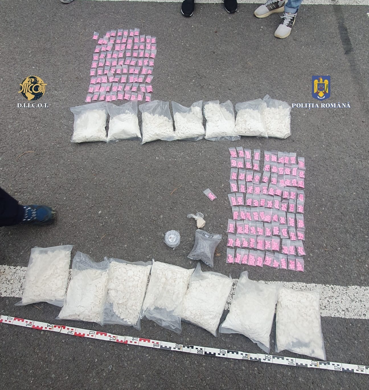 Astfel, la data de 2 august a.c., au fost puse în aplicare 9 mandate de percheziție domiciliară, în urma cărora au fost descoperite și ridicate 1.780 de comprimate ecstasy (drog de mare risc), 14 kilograme de substanță psihoactivă 2-MMC, o pungă cu multiple fragmente solide de substanță de culoare maro închis, mai multe plicuri cu substanță cristalină, 9 cutii cu substanțe anabolizante, un cântar, un grinder și mai multe obiecte purtând urme de substanță, o armă neletală și mai multe cartușe, sume de bani în lei și euro, dispozitive de stocare a datelor, precum și alte mijloace de probă.