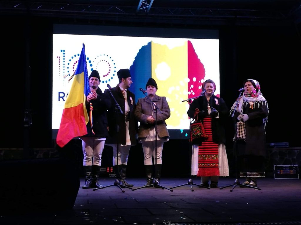 La ora 15:30 a fost difuzată parada de 1 Decembrie de la Alba Iulia pe un ecran led de mari dimensiuni pe scena amplasată în Parcul Teilor.