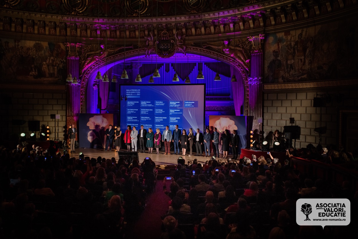 București, 10 octombrie 2023. Gala Premiilor pentru Directorii Anului 2023, organizată de AVE pentru al șaptelea an consecutiv, și-a desemnat câștigătorii aseară la Ateneul Român. Astfel, patru directori de școală din România care au transformat viețile elevilor, dar și școlile pe care le conduc au fost premiați pentru proiectele în care s-au implicat în anul școlar 2022 – 2023. Directorul Anului 2023 a fost desemnată Raluca Mariana Cozma de la Școala Gimnazială „Ion Ghica” din Iași.