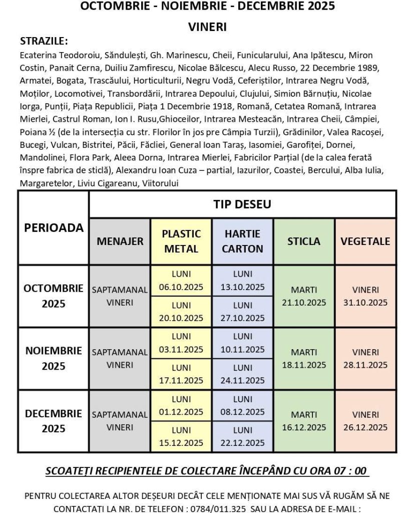 Vă punem la dispoziție programul de colectare a deșeurilor pentru următoarele trei luni.