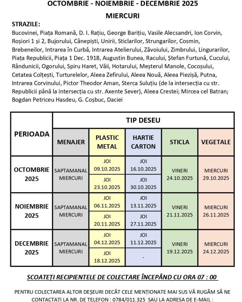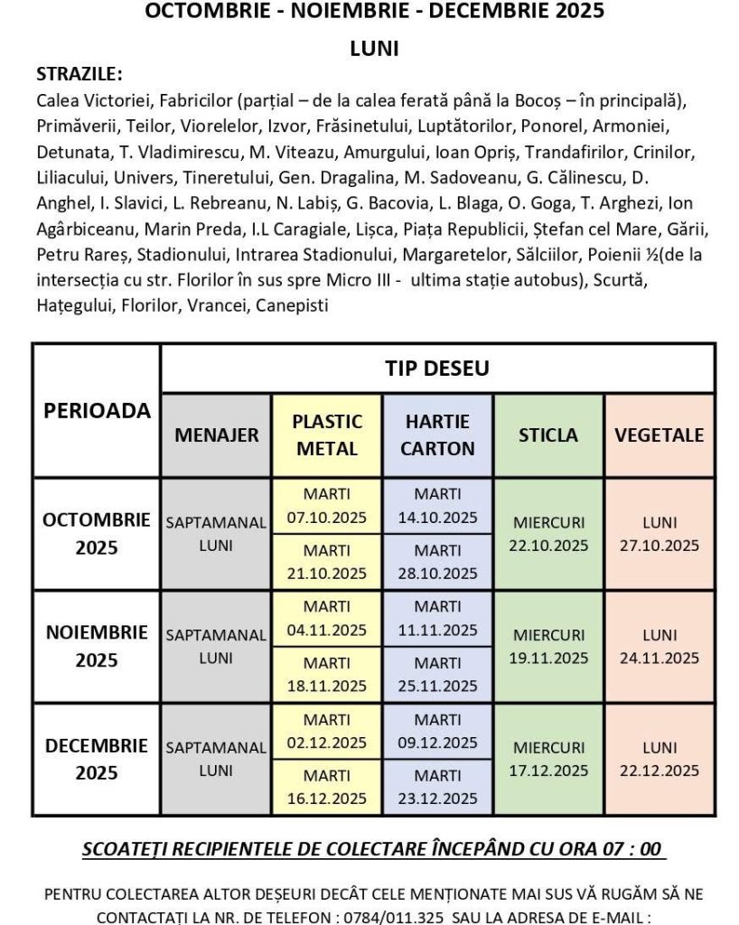 ✅ Colectarea se face săptămânal, conform zonelor și zilelor stabilite în grafic.