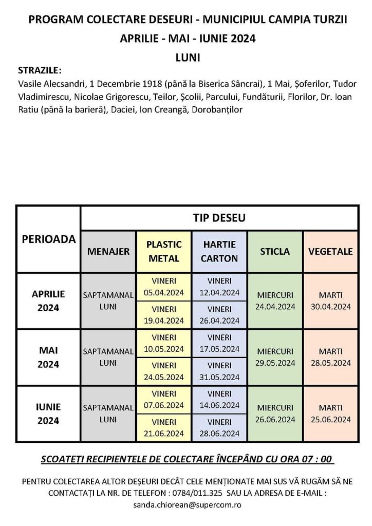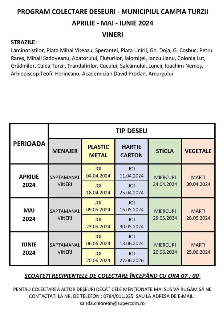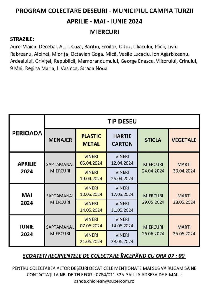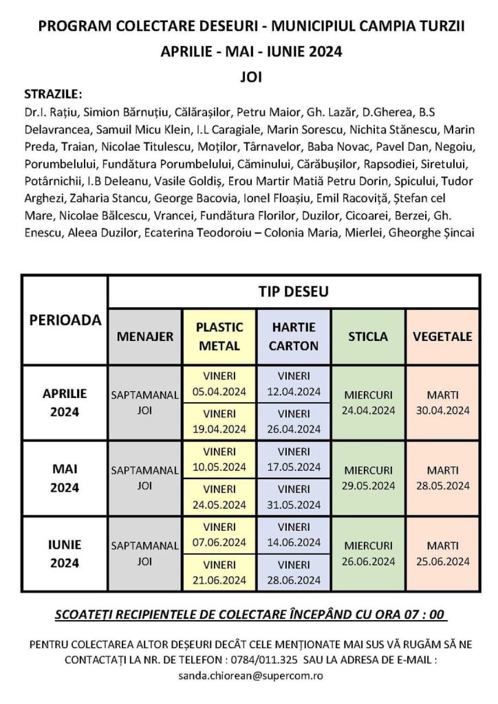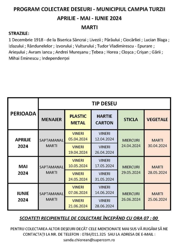 Actualitate Graficul de colectare a deșeurilor menajere și reciclabile în Municipiul Câmpia Turzii, în perioada Aprilie – Iunie 2024 ziarul21.ro 3 aprilie 2024, 10:38 Share Tweet Share Share Email Comments Related Items:campia turzii, Featured, Graficul de colectare a deșeurilor menajere și reciclabile în Municipiul Câmpia Turzii, în perioada aprilie – iunie 2024, ziarul 21 Share Tweet Share Share Email Recommended for you BĂRBAT ARESTAT PREVENTIV PENTRU AMENINȚARE ȘI ÎNCĂLCAREA ORDINULUI DE PROTECȚIE Cursanți ai Facultății de Comandă și Stat Major, în vizită la Baza 71 Aeriană din Câmpia Turzii Continuă înscrierile pentru concursul de biciclete „Surprizele Iepurașului” – 5 aprilie 2026 Click to comment Leave a Reply Anulează răspunsulComentariile trebuie să respecte regulile de utilizare.Adresa ta de email nu va fi publicată. Câmpurile necesare sunt marcate cu *Comentariu * Nume * Email * Δ Acest site folosește Akismet pentru a reduce spamul. Află cum sunt procesate datele comentariilor tale.