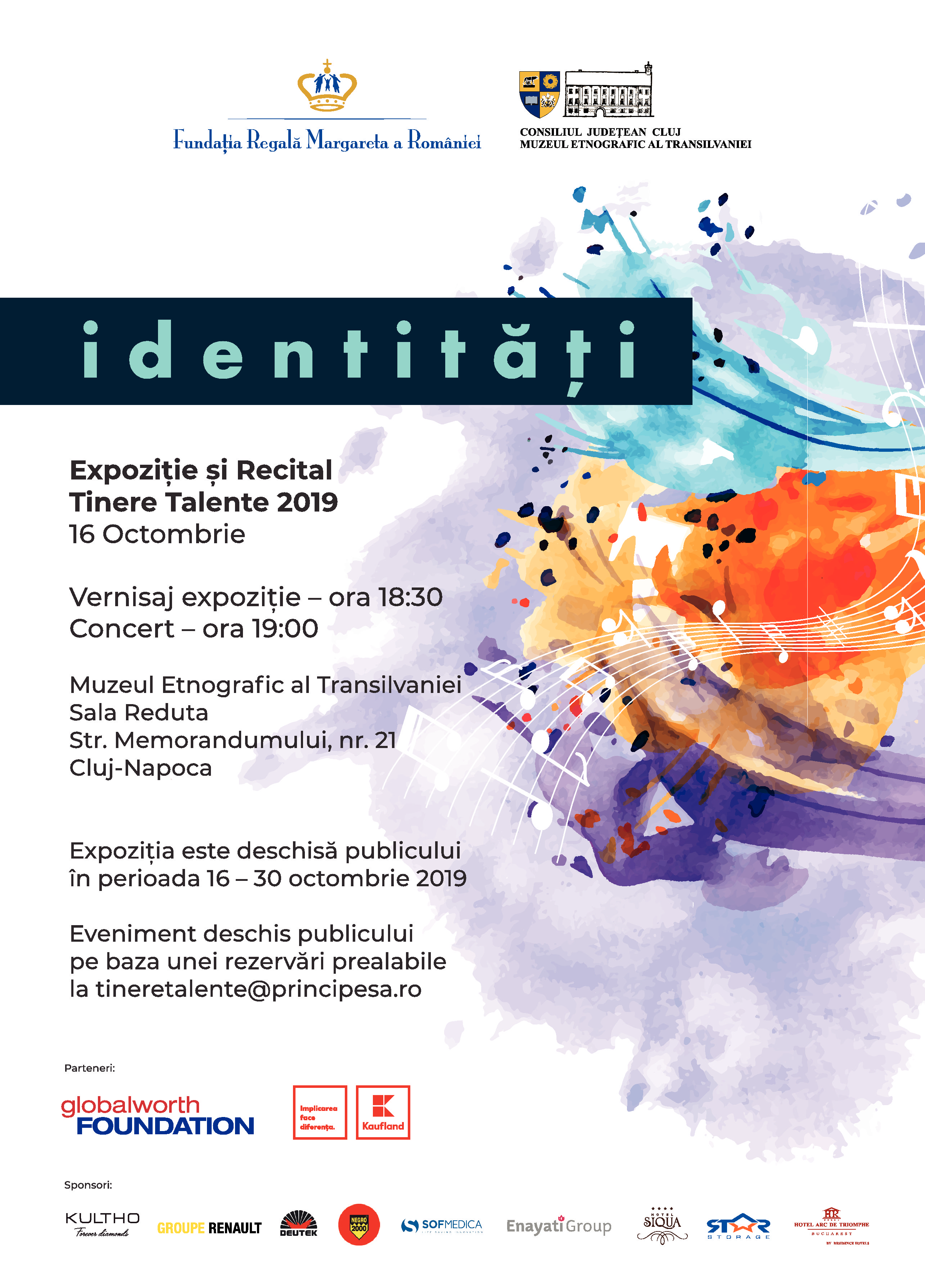 Fundația Regală Margareta a României, în parteneriat cu Muzeul Etnografic al Transilvaniei, instituție publică de cultură care funcționează sub autoritatea Consiliului Județean Cluj, vă invită la vernisajul unei expoziții de arte vizuale și a unui recital de muzică clasică în cadrul evenimentului Identități, miercuri, 16 octombrie 2019, începând cu ora 18:30.