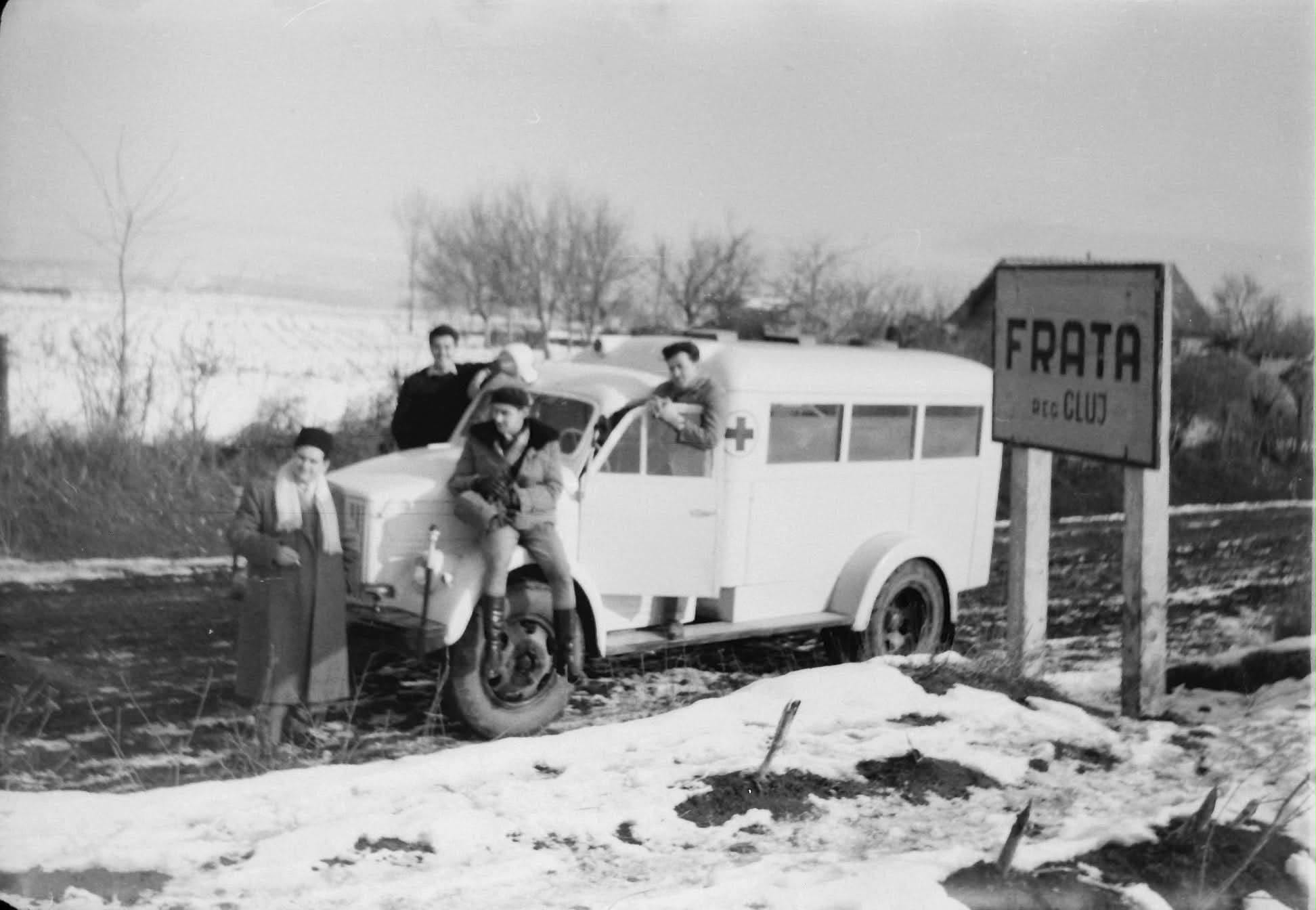 Fotografia îi surprinde pe membrii echipei – medici, asistenți și șoferul – alături de autosanitară, într-un decor dominat de zăpadă, frig și drumuri greu practicabile. Indicatorul rutier „FRATA – Reg. Cluj” confirmă locul și contextul, iar prezența ambulanței cu crucea medicală este un simbol puternic al grijii pentru comunitate într-o epocă în care medicina se făcea adesea „pe teren”, în condiții dificile.