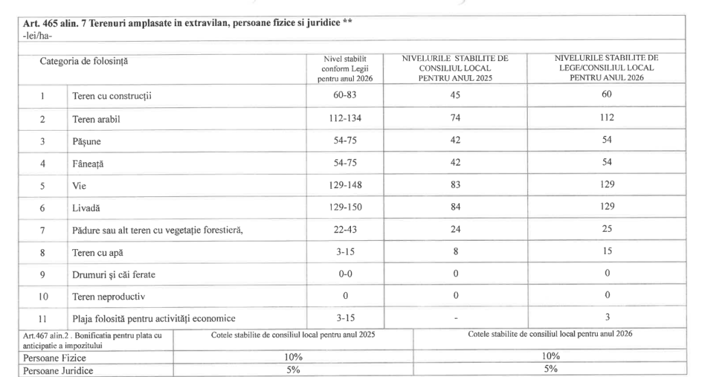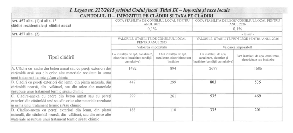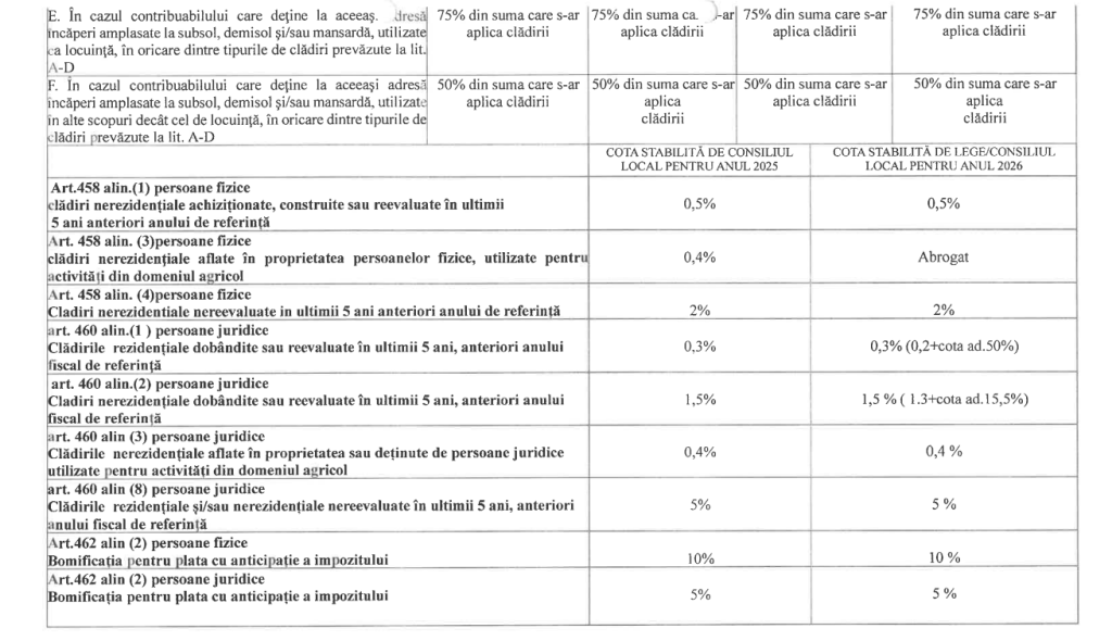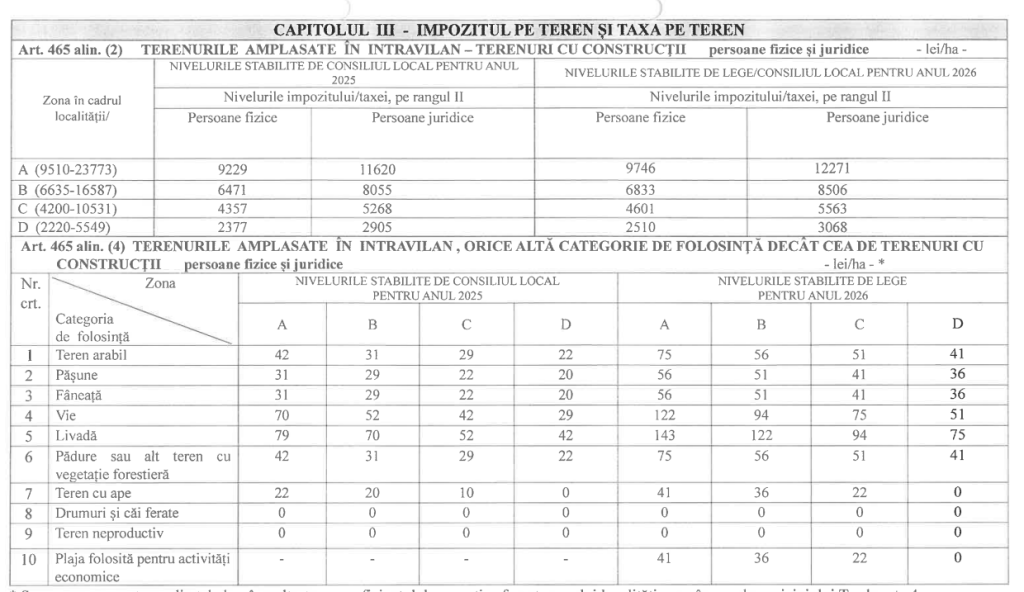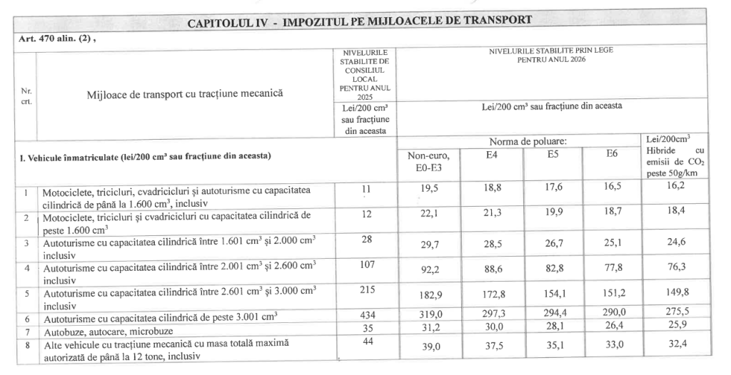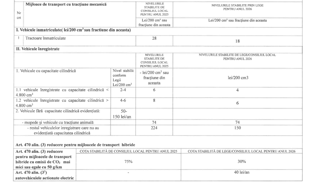 Hotărârea stabilește nivelurile impozitelor pe clădiri, terenuri, mijloace de transport, precum și taxele speciale aplicabile în anul 2026, conform anexelor care fac parte integrantă din actul normativ. De asemenea, sunt prevăzute distinct impozitele pentru autovehiculele grele de marfă cu masa totală autorizată de minimum 12 tone.