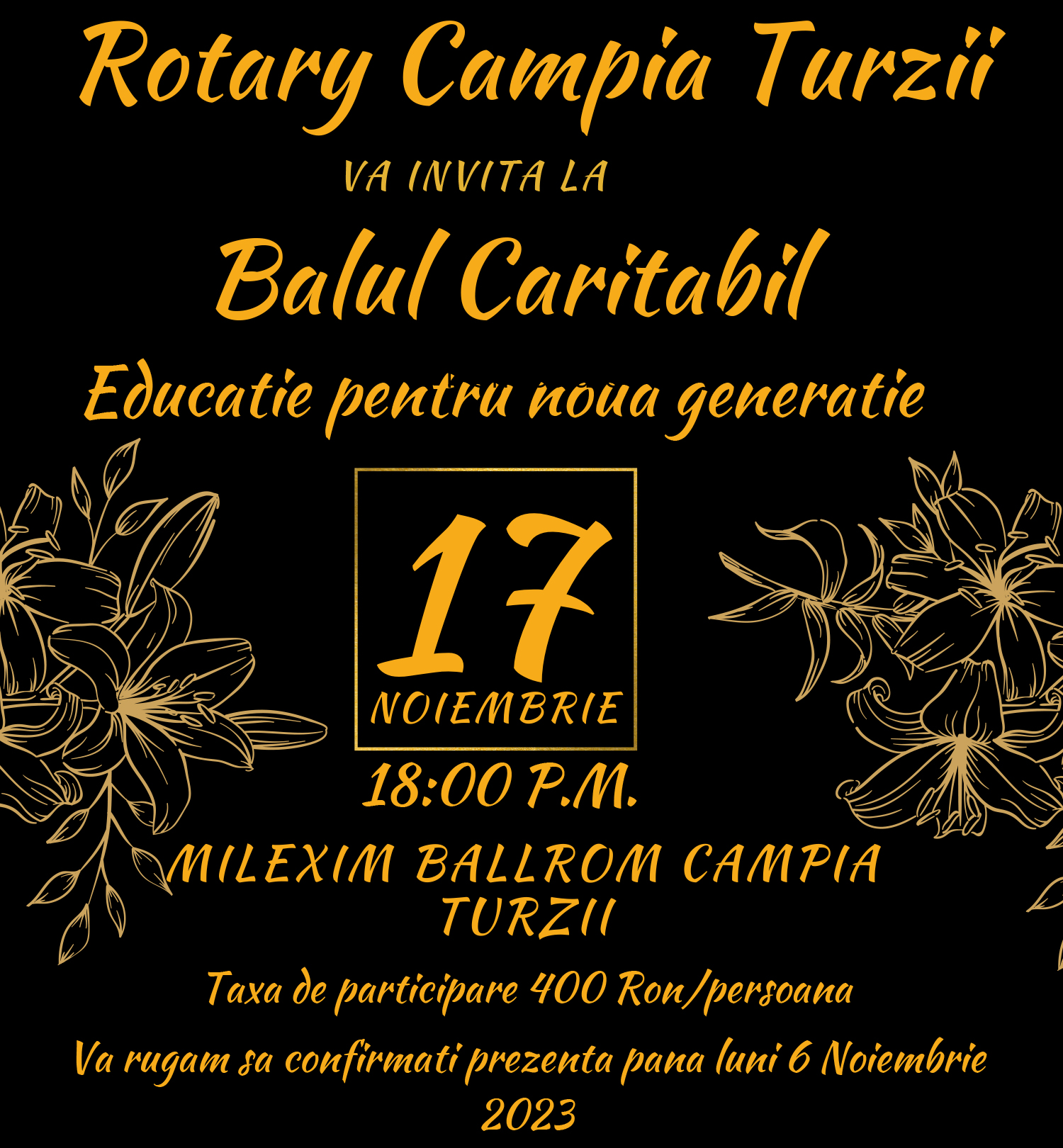 In 17.11.2023 va avea loc cel mai important eveniment al Clubului Rotary Campia Turzii – Balul de caritate 2023 – un eveniment dedicat susținerii si finanțării programelor educaționale din comunitatea noastră continuând sa cream acel univers in care speranța reușește sa ne tina împreuna si sa ne mobilizeze pentru a servi mai presus de sine.