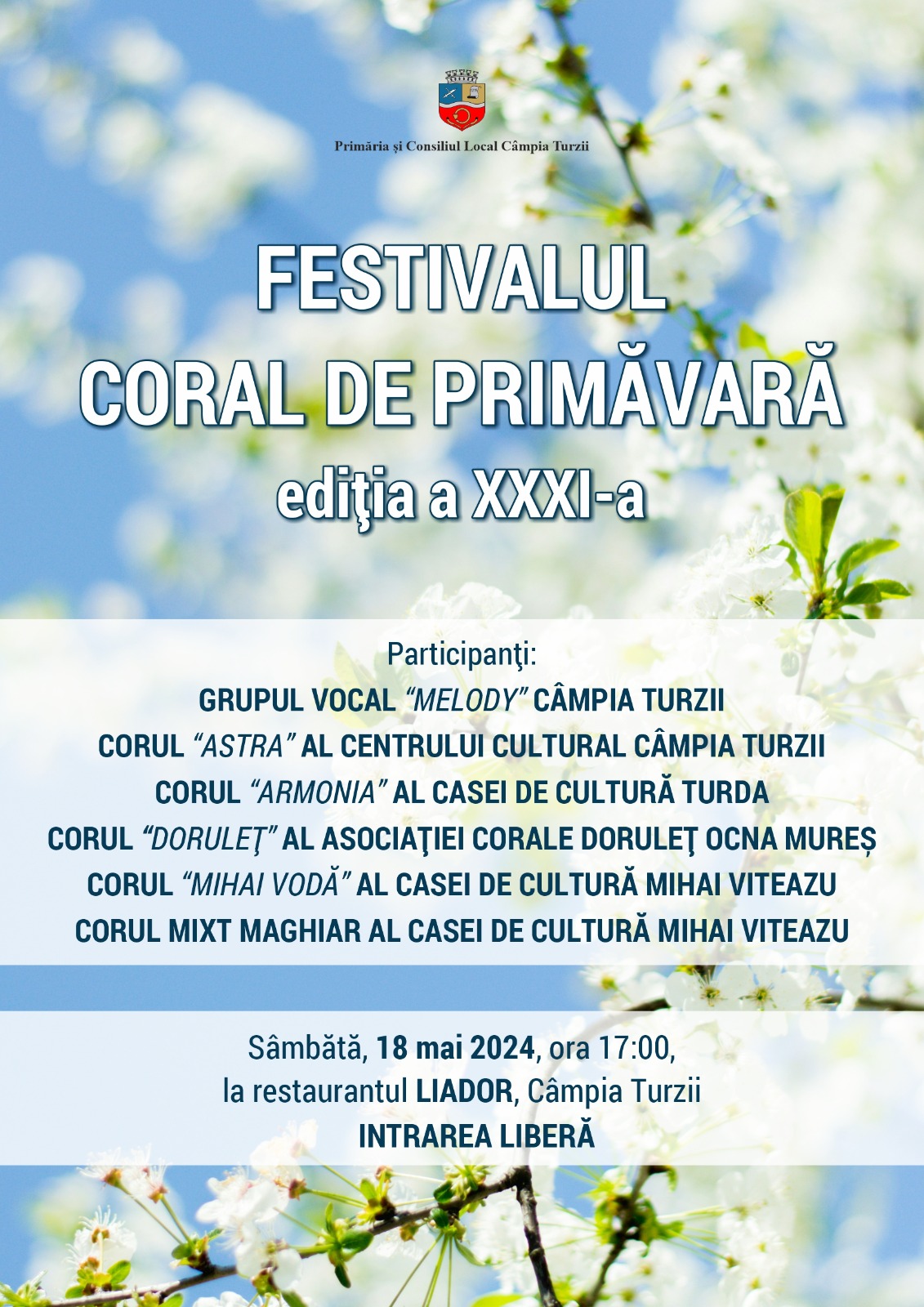 Municipiul Câmpia Turzii vă invită să vă bucurați de un regal al muzicii corale, în cadrul celei de-a XXXI-a ediții a Festivalului Coral de Primăvară. Evenimentul va avea loc sâmbătă, 18 mai 2024, de la ora 17:00, în ambianța elegantă a Restaurantului „Liador”.