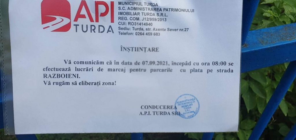 Administrația Patrimoniu Imobiliar din Turda a amplasat pe strada Războieni din Turda mai multe afișe prin care atenționează pe cei care parchează pe această strada, că în cursul zilei de mâine, 7 septembrie începând cu ora 8 se vor efectua marcaje pentru parcările cu plată și roagă toți șoferii sa elibereze zona.