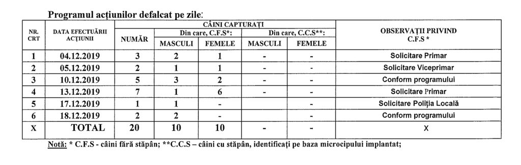 Raport de activitate privind acțiunea de capturare a câinilor fără stăpân în luna decembrie 2019.