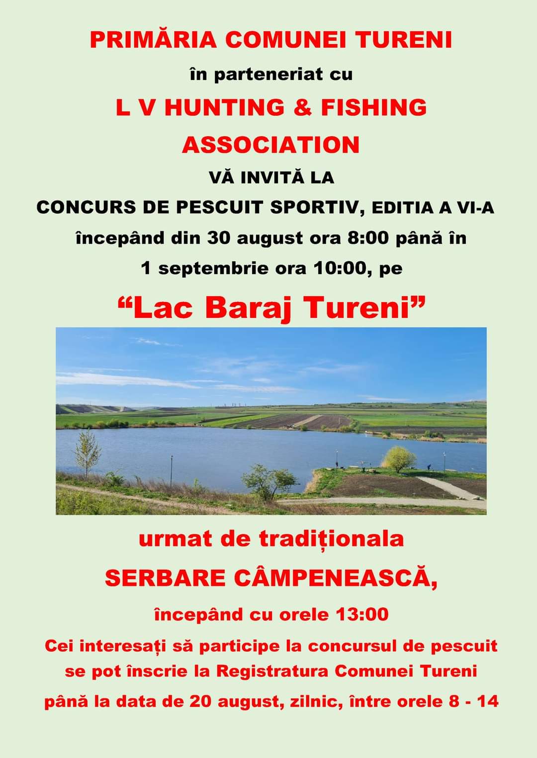 Primăria Comunei Tureni, în parteneriat cu L V Hunting & Fishing Association vă invită la tradiționalul Concurs de Pescuit Sportiv, ediția a VI-a. Evenimentul va avea loc în perioada 30.08.2024 (orele 8:00) – 01.09.2024 (orele 10:00), pe Lac Baraj Tureni.
