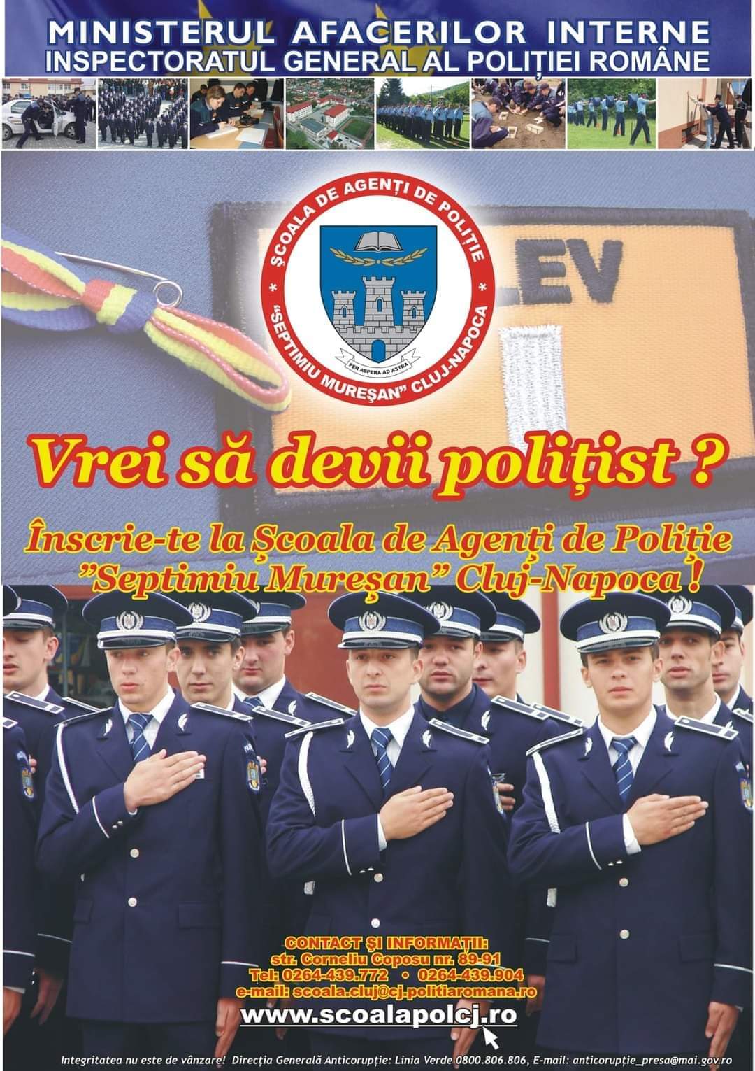 Şcoala de Agenţi de Poliţie „Septiniu Mureşan” Cluj-Napoca scoate la concursul de admitere sesiunea februarie – aprilie 2021 un număr de 200 de locuri, dintre care 4 pentru romi şi 3 pentru alte minorităţi.