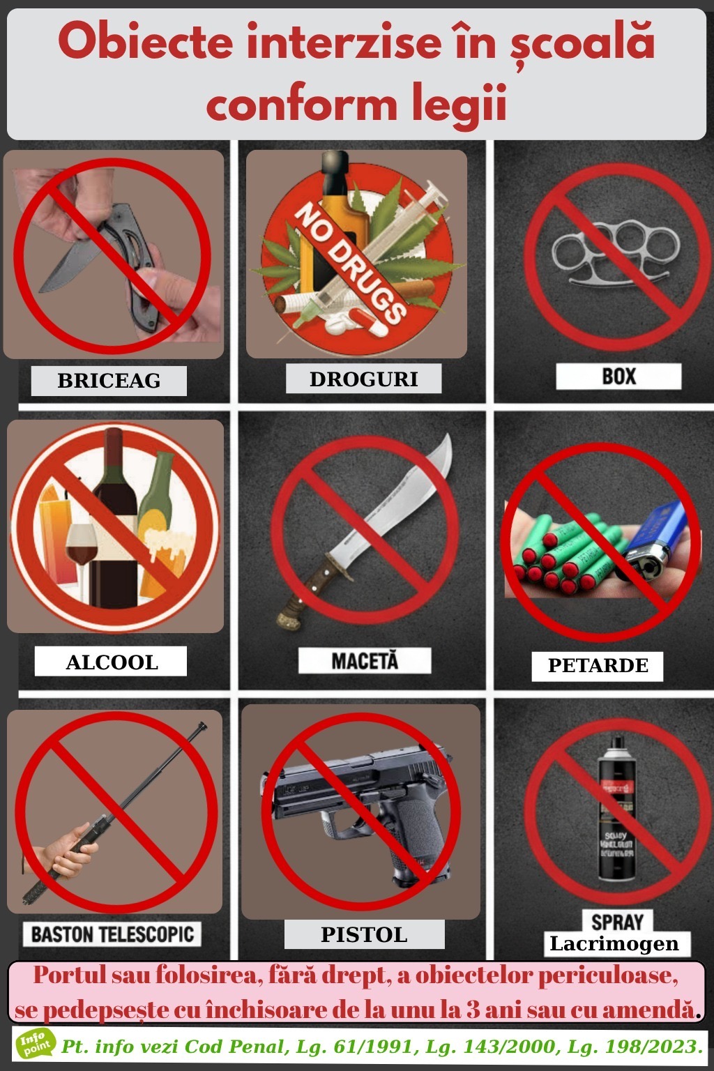 Polițiștii reamintesc faptul că introducerea în unitățile de învățământ a obiectelor care pot pune în pericol siguranța elevilor și a personalului didactic – precum arme, replici de arme, obiecte tăietoare, contondente sau alte bunuri similare – este strict interzisă.