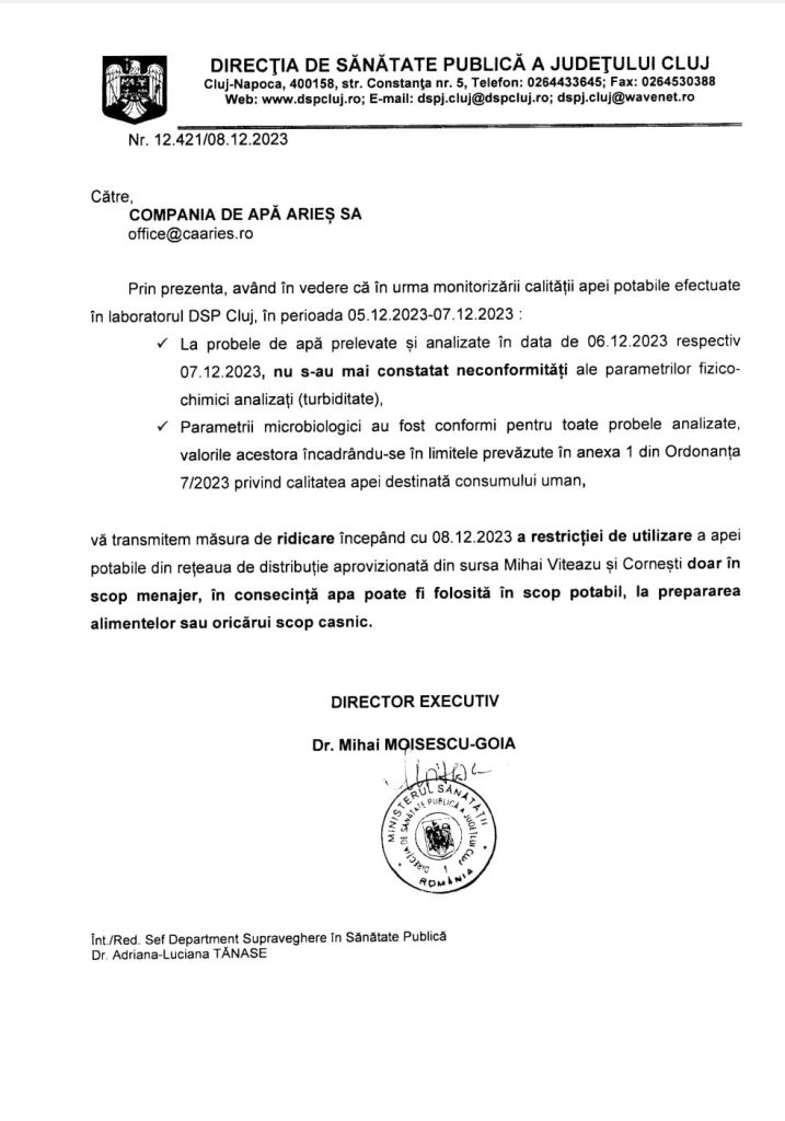 Echipele de intervenție au monitorizat cu atenție situația provocată de creșterea debitului râului Arieș, în urma căreia au fost inundate fronturi de captare din sursa Cornești ce furnizează apa potabilă către municipiul Turda, prin prelevarea de probe și testarea calității apei de câteva ori pe zi din puncte multiple din arealul de deservire. Buletinele de analize sunt disponibile și pot fi consultate pe site-ul societății noastre www.caaries.ro accesând link-ul: https://caaries.ro/buletin-de-analiza/