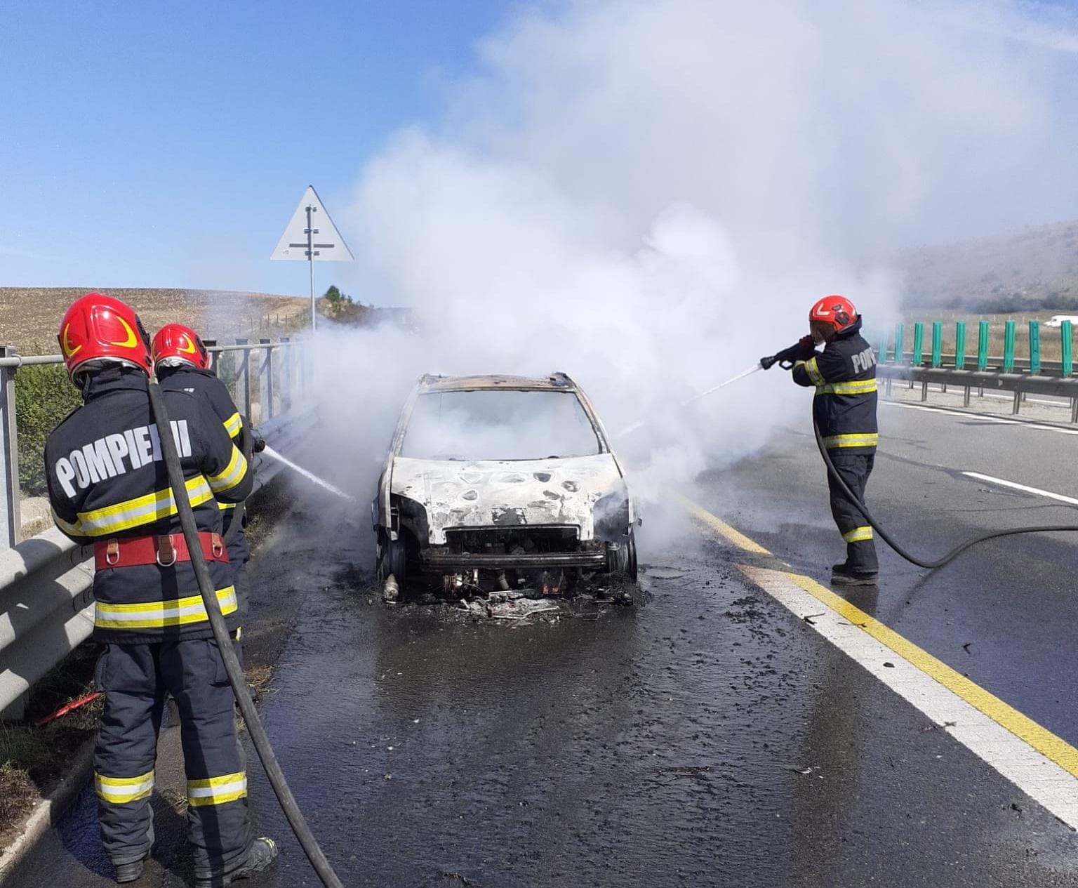 Intervenție pentru stingerea unui incendiu care a cuprins un autoturism pe autostrada A3