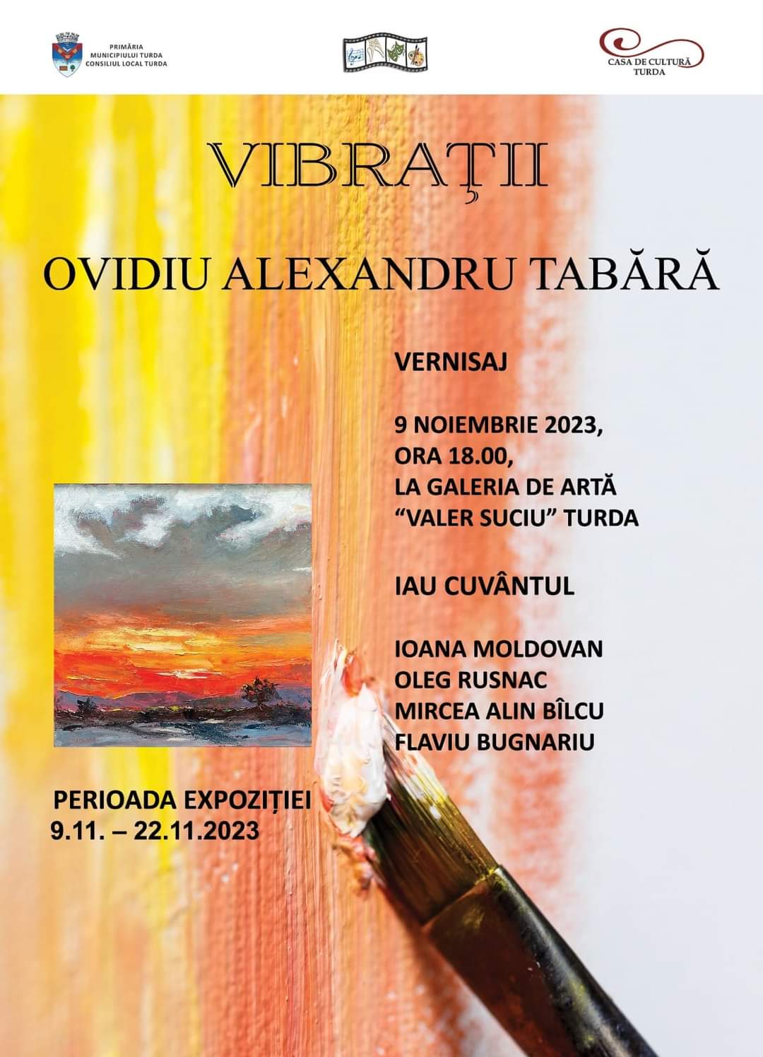 Joi, 9 noiembrie 2023, de la ora 18:00, sunteți invitați la Galeria de Artă „Valer Suciu” să participați la vernisajul Expoziției de Pictură, intitulată „Vibrații”.