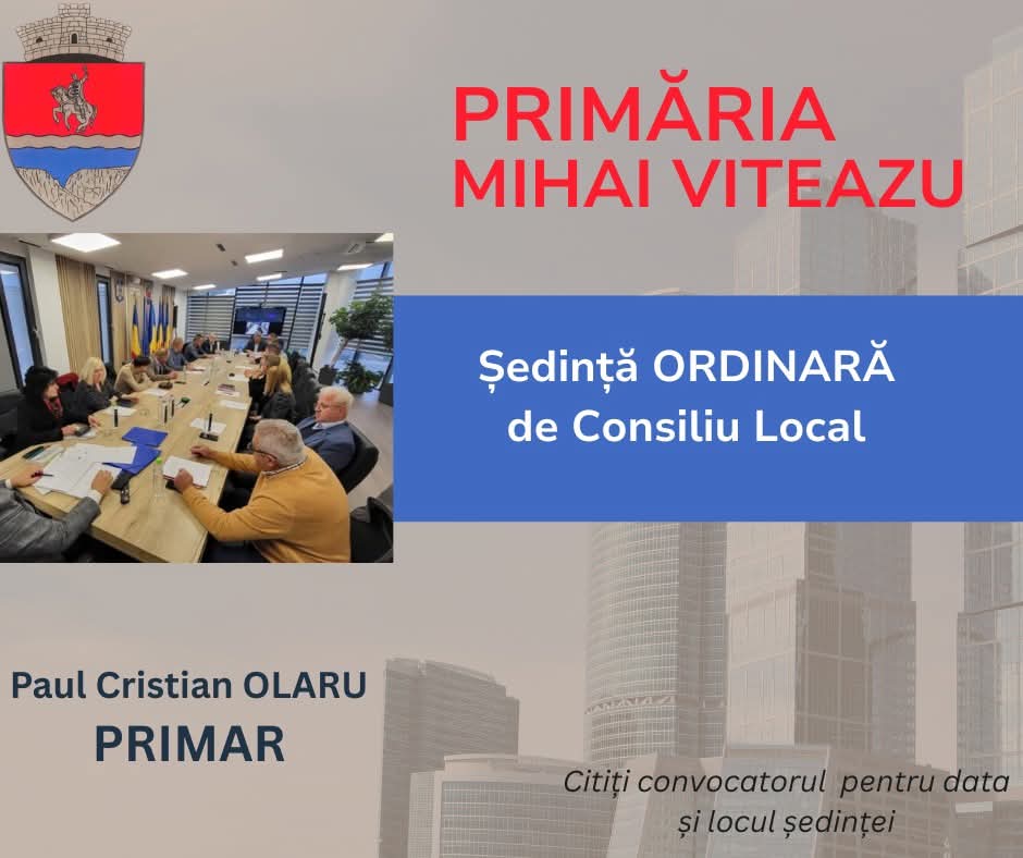 Primarul Comunei Mihai Viteazu, domnul Paul Cristian OLARU, a convocat Consiliul Local în ședință ordinară, de la ora 8:00, în Sala de Ședințe a Primăriei.