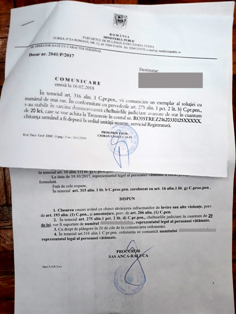 Tatăl copilului M.R.C. a formulat o plângere prealabilă la Poliţia Municipiului Turda, în urma căreia s-a dispus începerea urmăririi penale sub aspectul săvârşirii infracţiunilor de lovire sau alte violenţe.