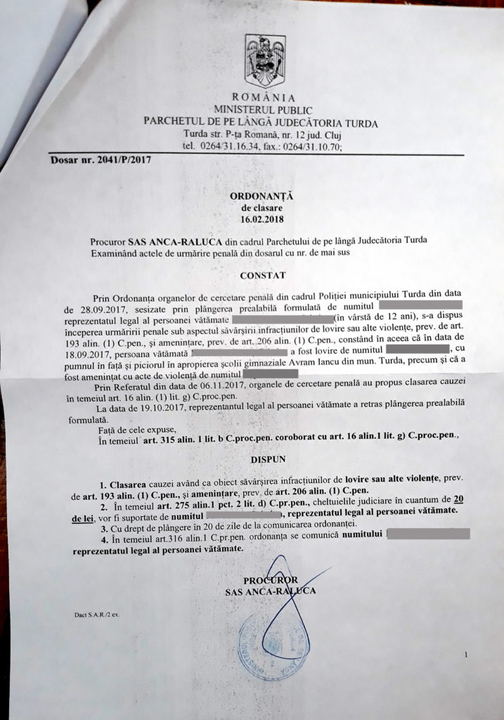 Tatăl copilului M.R.C. a formulat o plângere prealabilă la Poliţia Municipiului Turda, în urma căreia s-a dispus începerea urmăririi penale sub aspectul săvârşirii infracţiunilor de lovire sau alte violenţe.