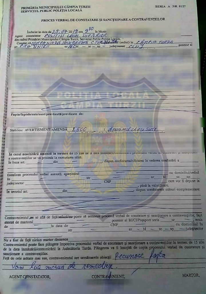 Având în vedere faptul că în nenumărate rânduri operatorul de salubritate din municipiul Câmpia Turzii a încălcat legislația de mediu, prin murdărirea domeniului public cu diverse scurgeri din mașina de transport deșeuri, precum și a disconfortului creat cetățenilor, luând în considerare și sesizările venite din partea dumneavoastră, vă informăm că societatea a fost sancționată contravențional cu amendă în sumă de 2.500 lei.