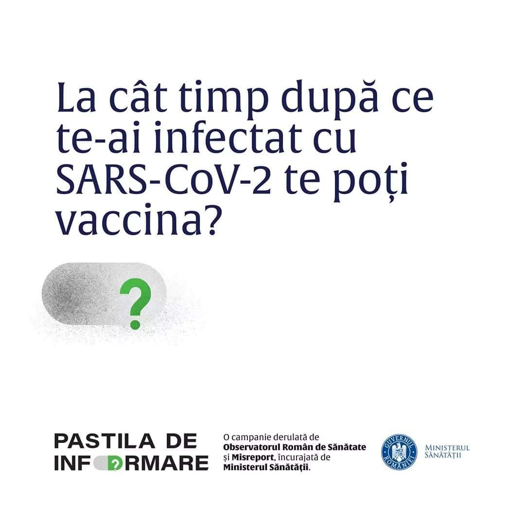 b) Pentru persoanele care au s-au infectat DUPĂ prima doză de vaccin, specialiștii recomandă continuarea schemei cu cea de-a doua doză, fără reluarea primei doze, la cel puțin 14 zile de la finalizarea izolării pentru pacienții asimptomatici sau 14 zile de la dispariția simptomelor, pentru cei simptomatici.