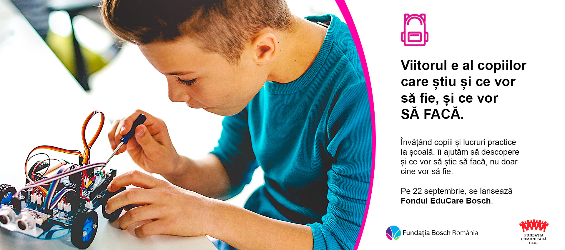 Fondul EduCare Bosch, gestionat de Fundația Comunitară Cluj, își propune să schimbe modul în care programăm viitorul copiilor, propunând să le dăm acestora posibilitatea de a descoperi mai întâi că stă în puterea lor SĂ FACĂ lucruri și că pot decide după în ce direcție și cât de mult vor să se specializeze. Scopul acestui fond este de a ajuta copiii și tinerii să înțeleagă că împlinirea profesională nu stă în numărul diplomelor pe care le ai, ci în diferența pe care o faci în viața oamenilor, prin CEEA CE FACI. Că nu meseria/profesia pe care o ai este importantă, ci cât ești tu de meseriaș/specialist. Iar obiectivul Fondului este de a finanța inițiativele care contribuie la atingerea acestui scop, în școlile de gimnaziu și liceu din județul Cluj, din mediul rural și urban mic.