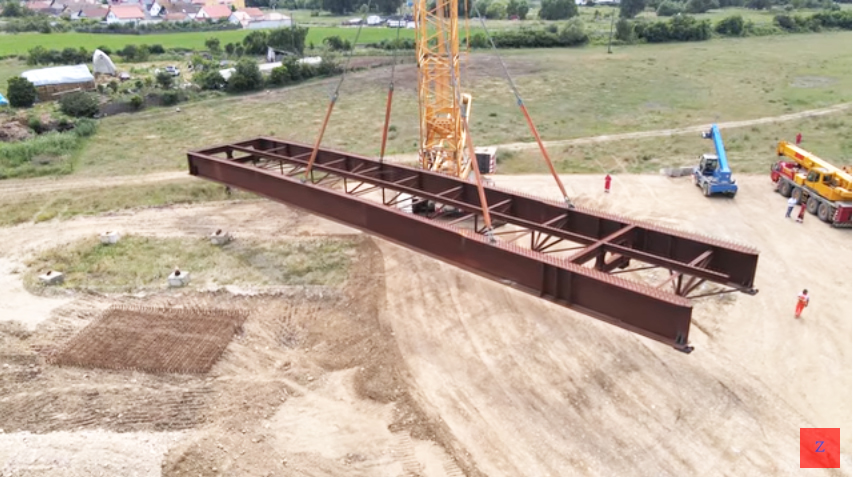 La ridicarea tablierului metalic a fost folosită o macara șenilată, care după un scurt și spectaculos balet aerian de circa 30 de minute a ridicat tablierul metalic de 80 de tone și l-a poziționat pe cele două culee.