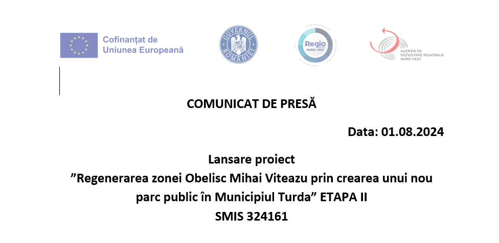 AGENȚIA DE DEZVOLTARE REGIONALĂ NORD-VEST, în calitate de Autoritate de Management pentru Programul Regional Nord-Vest 2021 – 2027 și Unitatea Administrativ-Teritorială Municipiul Turda în calitate de Beneficiar au semnat Contractul de finanțare nerambursabilă nr.46/12.06.2024, Cod SMIS 324161, pentru proiectul ”Regenerarea zonei Obelisc Mihai Viteazu prin crearea unui nou parc public in Municipiul Turda” ETAPA II.