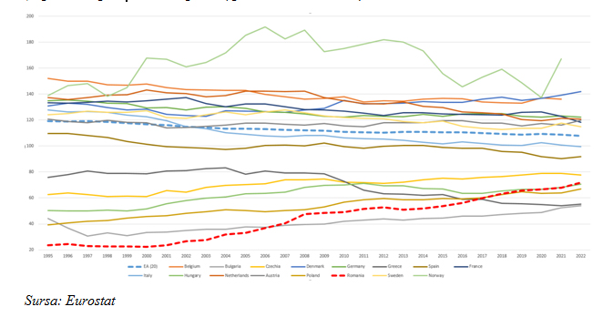 Figura 1. Productivitatea orară în termeni nominali exprimată ca procent din media UE-27 (la paritatea puterii de cumpărare, perioada 1995 – 2022)
