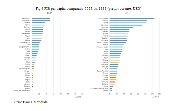 Tendințele în evoluția PIB per capita descrise mai sus pentru România sunt corelate cu cele ale țărilor din regiune, dar și la nivelul de ansamblu al Uniunii Europene. Figura 4 compară nivelul PIB per capita doar între anii de început și de sfârșit ai perioadei analizate, respectiv 1995 versus 2022, dar pentru o selecție mult mai largă de state din spațiul geografic european. Pentru că a pornit cu un decalaj foarte mare, deși a crescut foarte rapid, în ultimii 27 de ani România a câștigat doar două poziții în clasamentul regional, surclasând Bulgaria și Serbia, dar rămânând în continuare în urma Poloniei, Ungariei și, mai ales, a Cehiei. Totuși diferențele (în termeni procentuali) sunt mult mai mici în 2022 comparativ cu nivelurile din 1995. Față de Cehia (cea mai avansată din regiune), acum avem de recuperat un decalaj de 74 la sută ceea ce este o îmbunătățire față de nivelul de 253 la sută din 1995. Iar Polonia și Ungaria ne depășesc cu 15 și respectiv 16 procente, față de 123 la sută și, respectiv, 172 la sută în 1995.