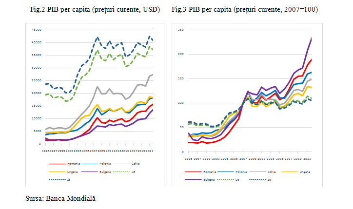 Figurile 2 și 3 de mai sus, realizate prin prelucrarea unor date publicate de Banca Mondială, confirmă faptul că progresul economic al României din ultimii 27 de ani a fost remarcabil. Același lucru se poate spune însă și despre Bulgaria, Ungaria, Cehia și Polonia, precum și despre Uniunea Europeană în ansamblu. Graficele indică însă particularități ale diferitelor perioade de timp și dinamici diferite între țări.
