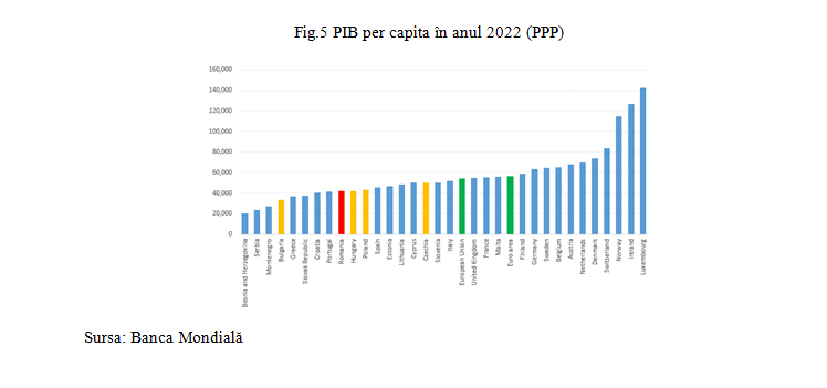 Interesantă și totodată relevantă din această comparație între metode este și observația că,atunci când ajustăm cu nivelul diferit al prețurilor (așadar când facem trecerea de la PIB per capita exprimat în dolari SUA către PIB per capita ținând seama de PPP), România se clasează în 2022 peste Slovacia, Croația, Grecia și Portugalia, așa cum reiese din Figura 5 de mai jos (în opoziție cu imaginea oferită de graficul din dreapta al Figurii 4 de mai sus). Modificarea poziției României în clasament față de Grecia și Portugalia la schimbarea de metodă arată tocmai faptul că raportarea la PPP aduce un unghi nou(și totodată relevant) analizei, în special atunci când țările care sunt comparate au niveluri semnificativ diferite ale dezvoltării economice de ansamblu.