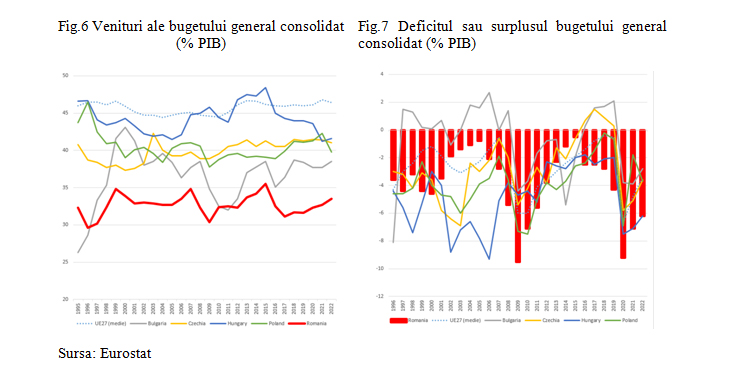 Observațiile formulate mai sus nu sunt însă specifice României. Însă, așa cum arată Figura 6 de mai jos, unul dintre elementele prin care România s-a singularizat în cadrul regiunii pe parcursul ultimilor 27 de ani a fost nivelul în permanență mai redus al veniturilor bugetului general consolidat(ca pondere în PIB) față de celelalte țări. Nu un an, nu cinci, nu zece, ci douăzeci și șapte de ani la rând, ponderea în PIB a veniturilor bugetului general consolidat a fost în cazul României semnificativ mai mică decât în Polonia, Ungaria și Cehia. Inclusiv în Bulgaria ponderea a fost în majoritatea acestei perioade mai ridicată față de România, cu excepția anilor 1995-1996 și 2011.
