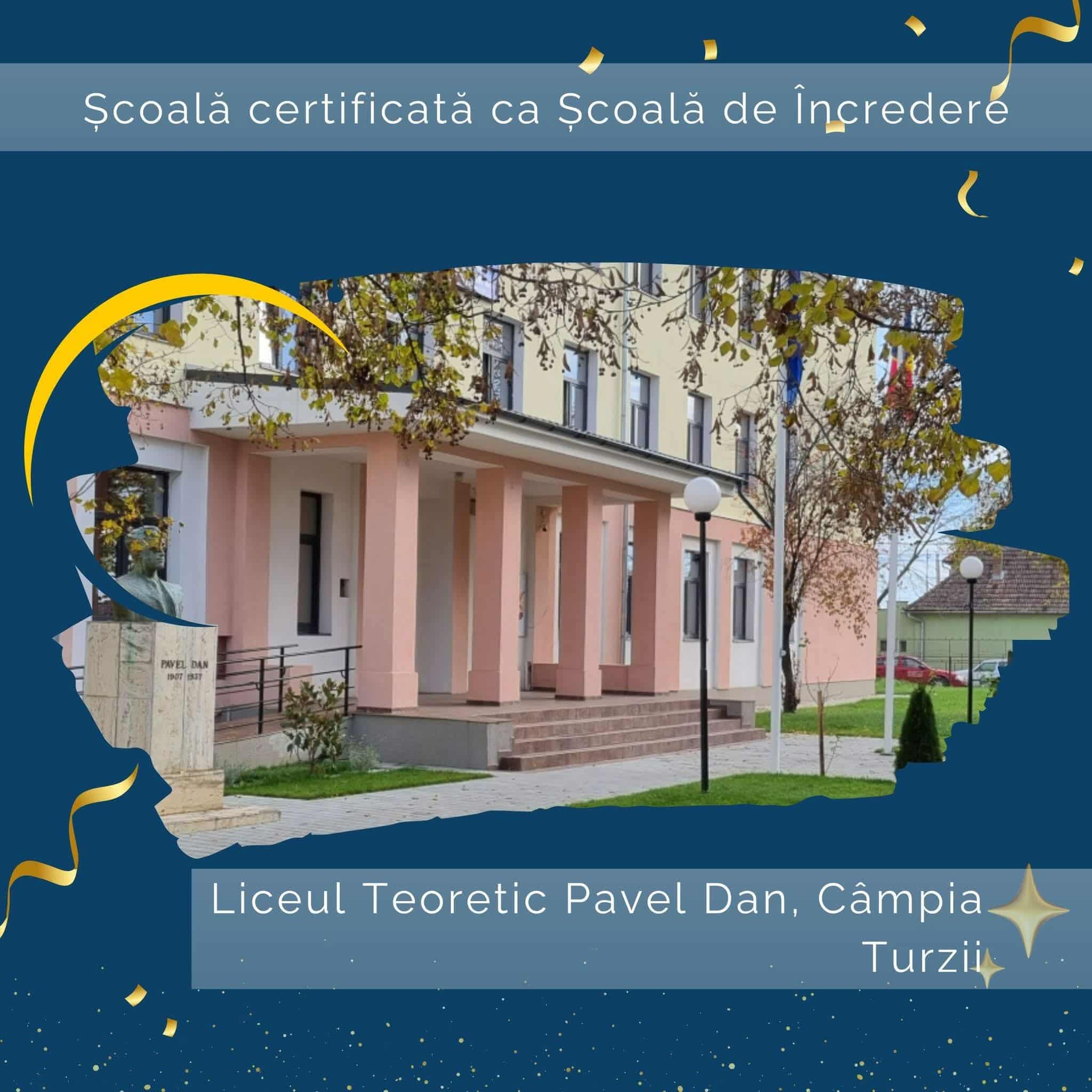Liceul Teoretic „Pavel Dan” din Câmpia Turzii a atins un nou reper în parcursul său educațional, devenind oficial Școală de Încredere, în urma finalizării cu succes a Programului Școala Încrederii, o inițiativă națională care transformă școlile din România în spații în care fiecare copil contează cu adevărat.