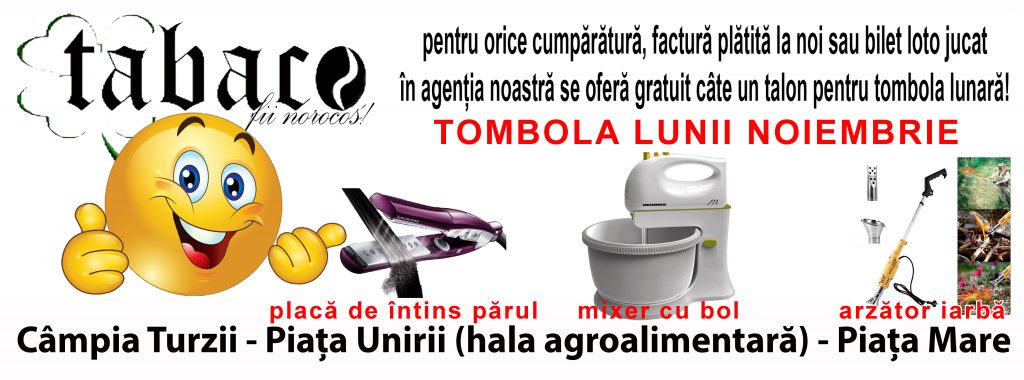 Tombola lunii noiembrie constă într-un aparat de ars iarba, un mixer cu bol și o placă de întins părul. Regulamentul tombolei este unul simplu, pentru fiecare bilet loto jucat în agenția noastră, pentru fiecare factură plătită la noi ori pentru fiecare cumpărătură de peste 30 lei ori Ziarul 21 cumpărat de la noi, se oferă câte un talon pentru tombola lunară. Mai multe taloane, mai multe șanse de câștig. Succes!