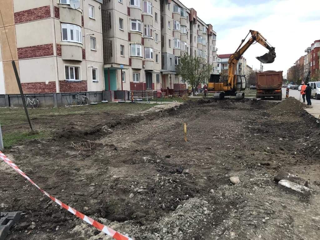 „Azi au început lucrările la noua parcare din cartierul Blocuri, pe str. Gh. Barițiu, nr. 40 (blocul cu balcoane rotunde), unde vor fi 51 de noi locuri de parcare auto și 4 moto.