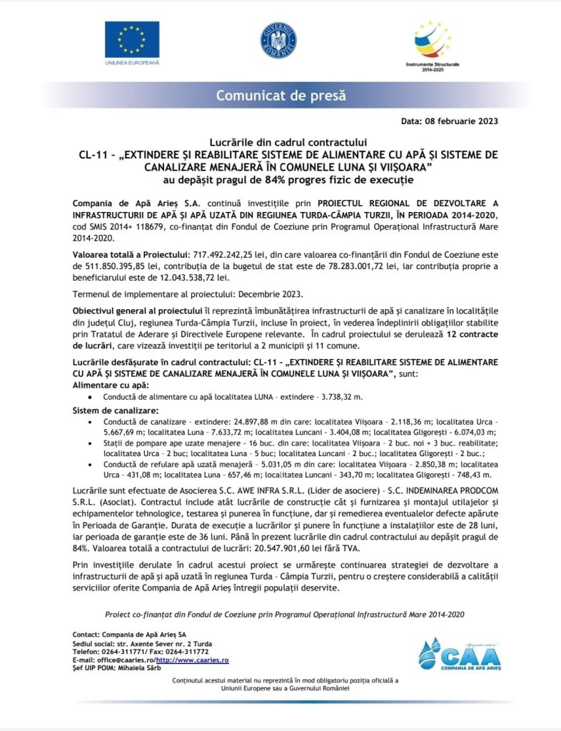 Compania de Apă Arieș S.A. continuă investițiile prin PROIECTUL REGIONAL DE DEZVOLTARE A INFRASTRUCTURII DE APĂ ȘI APĂ UZATĂ DIN REGIUNEA TURDA-CÂMPIA TURZII, ÎN PERIOADA 2014-2020, cod SMIS 2014+ 118679, co-finanțat din Fondul de Coeziune prin Programul Operațional Infrastructură Mare 2014-2020.