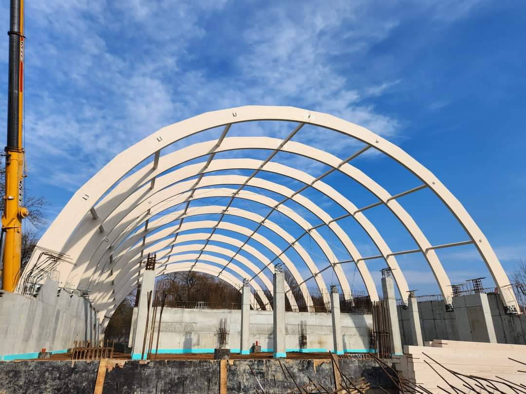 Lucrările de construire a bazinului au intrat într-o nouă fază de implementare, aducându-ne mai aproape de finalizarea proiectului.Constructorul a demarat montarea arcurilor de cerc care vor constitui acoperișul bazinului.