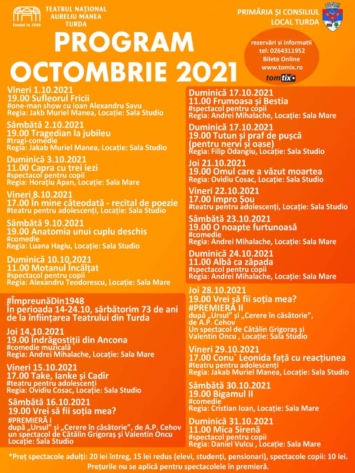 Toamna și-a intrat pe deplin în drepturi, iar TNAMT a pregătit pentru această lună o listă lungă de spectacole, comedii, drame, recitaluri de poezie, spectacole pentru copii, dar și un spectacol în premieră. De asemenea, în perioada 14-24.10, sărbătorim 73 de ani de la înființarea Teatrului din Turda, eveniment care va fi marcat la fel ca în fiecare an, printr-o serie de reprezentații speciale.