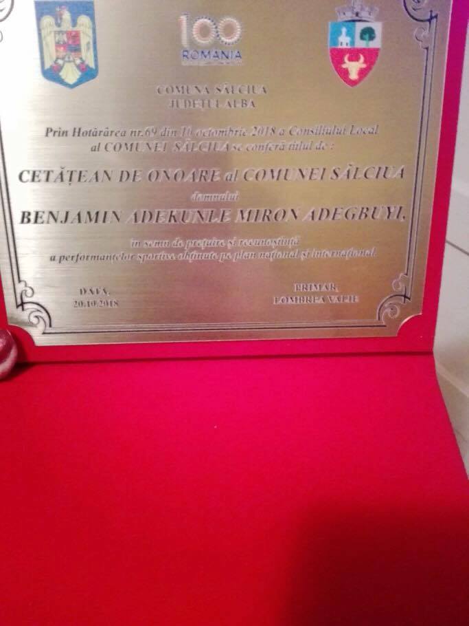 Prin Hotărârea nr.69 din 10 octombrie 2018 a Consiliului Local al Comunei Sălciua, Benny Adegbuyi a primit titlul de Cetăţean de Onoare al Comunei Sălciua, în semn de preţuire şi recunoştinţă a performanţelor sportive obţinute pe plan naţional şi internaţional.