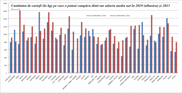 Cu foarte mici excepții, în 2019 cumperi mai puțini cartofi dintr-un salariu net decât acum 5 ani.