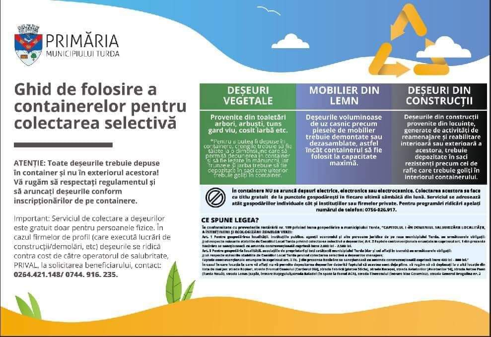 Totodată, vă reamintim că serviciul de colectare a deșeurilor este gratuit doar pentru persoanele fizice. În cazul firmelor de profil (care execută lucrări de construcții/demolări, etc) deșeurile se ridică contra cost de către operatorul de salubritate, SUPERCOM, la solicitarea beneficiarului, contact: 0784.011.325 sau la adresa de mail: alina.monea@supercom.ro.