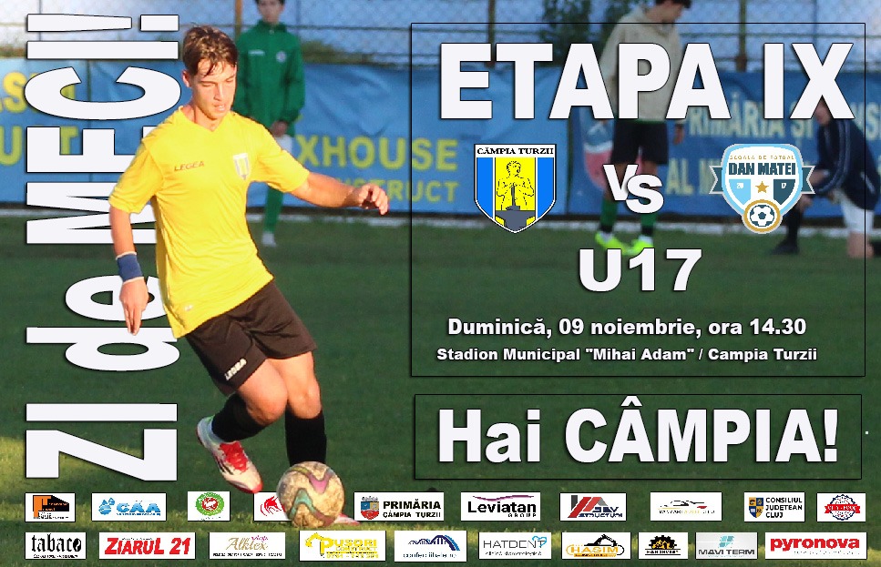 Duminică, de la ora 14.30 pe Stadionul Municipal din Câmpia Turzii, FC Câmpia Turzii întâlnește pe Școala de Fotbal “Dan Matei” din Cluj Napoca, meci ce contează pentru Etapa IX, grupa de vârstă U17.
