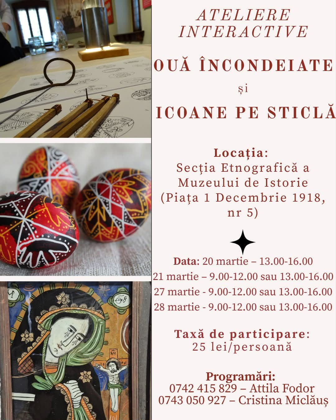 În cadrul atelierului vor fi prezentate toate etapele decorării ouălor, de la prepararea vopselelor şi prezentarea etapelor de protejare a fondului cu ceară topită, la o scurtă prezentare despre istoricul și dimensiunea culturală a acestui obicei. Participanții vor descoperi bogăţia modelelor ornamentale, structurate preponderent în motive vegetale, zoomorfe, motive inspirate după obiectele din gospodărie şi nu numai, şi vor afla denumirea şi semnificaţia acestora.