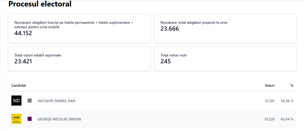 Actualitate Nicușor Dan câștigă Turda și Câmpia Turzii ziarul21.ro 18 mai 2025, 23:02 Share Tweet Share Share Email Comments Nicușor Dan câștigă Turda și Câmpia Turzii Prezența la urne a fost de 64,7%, cea mai mare din ultimii 25 de ani, cu 11,7 milioane de voturi exprimate, din care peste 10 milioane la secțiile din România și peste 1,6 milioane în diaspora. Cum a votat Câmpia Turzii: Cum a votat Turda: Related Items:Featured, Nicușor Dan câștigă Turda și Câmpia Turzii Share Tweet Share Share Email Click to comment Leave a Reply Anulează răspunsulComentariile trebuie să respecte regulile de utilizare.Adresa ta de email nu va fi publicată. Câmpurile necesare sunt marcate cu *Comentariu * Nume * Email * Δ Acest site folosește Akismet pentru a reduce spamul. Află cum sunt procesate datele comentariilor tale.