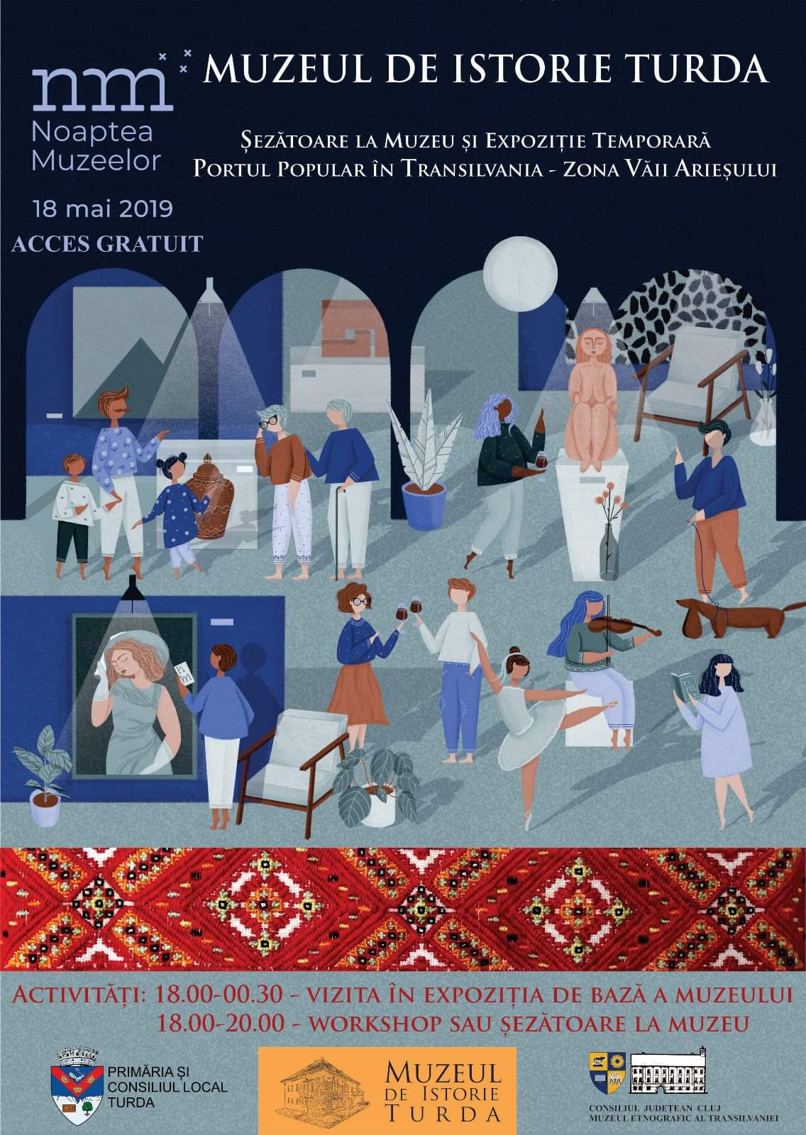 Invitație – Noaptea Muzeelor – Cea de-a XV-a ediție a Nopții Muzeelor va avea loc în 18 Mai 2019 la Turda. Astfel, toți cei care vor trece pragul Muzeului de Istorie Turda, după vizita expoziției de bază a muzeului, vor avea prilejul să participe la workshop-ul “Șezătoarea la muzeu”, organizat în cadrul expoziției temporare Portul popular în Transilvania – zona Văii Arieșului. Expoziția cuprinde costume populare din colecțiile Muzeului de Istorie Turda și din colecții private, specifice zonelor etnografice, precum Mocănimea Arieșului, Rimetea și Țara Moților. Sunteți așteptați cu drag!