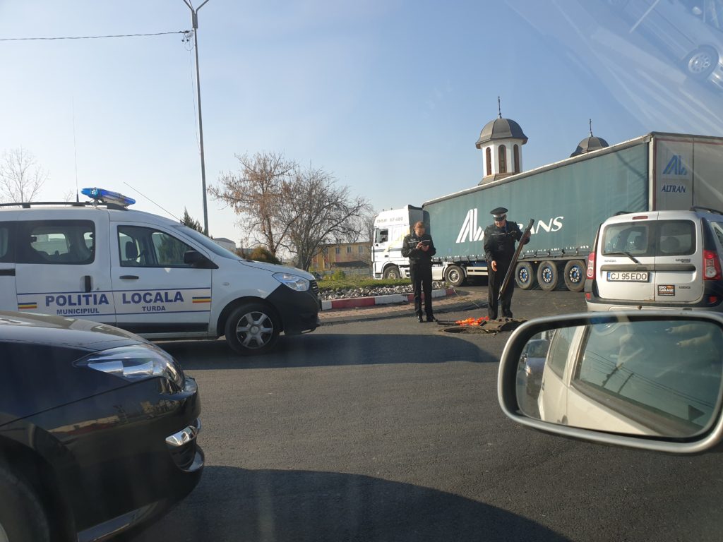 Azi, 13 Noiembrie, Poliția Locală a Municipiului Turda a fost prezentă la fața locului pentru a dirija traficul și totodată pentru a îndrepta acest semn, răsturnat de un conducător auto mai neatent.
